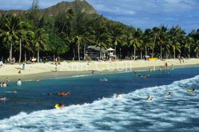 ![]() The Hawaiian Islands: Oahu 1732 - Diamond Head & Beach "Boogie boarders off the Kapahulu groin ( wall) at Waikiki, Oahu" |